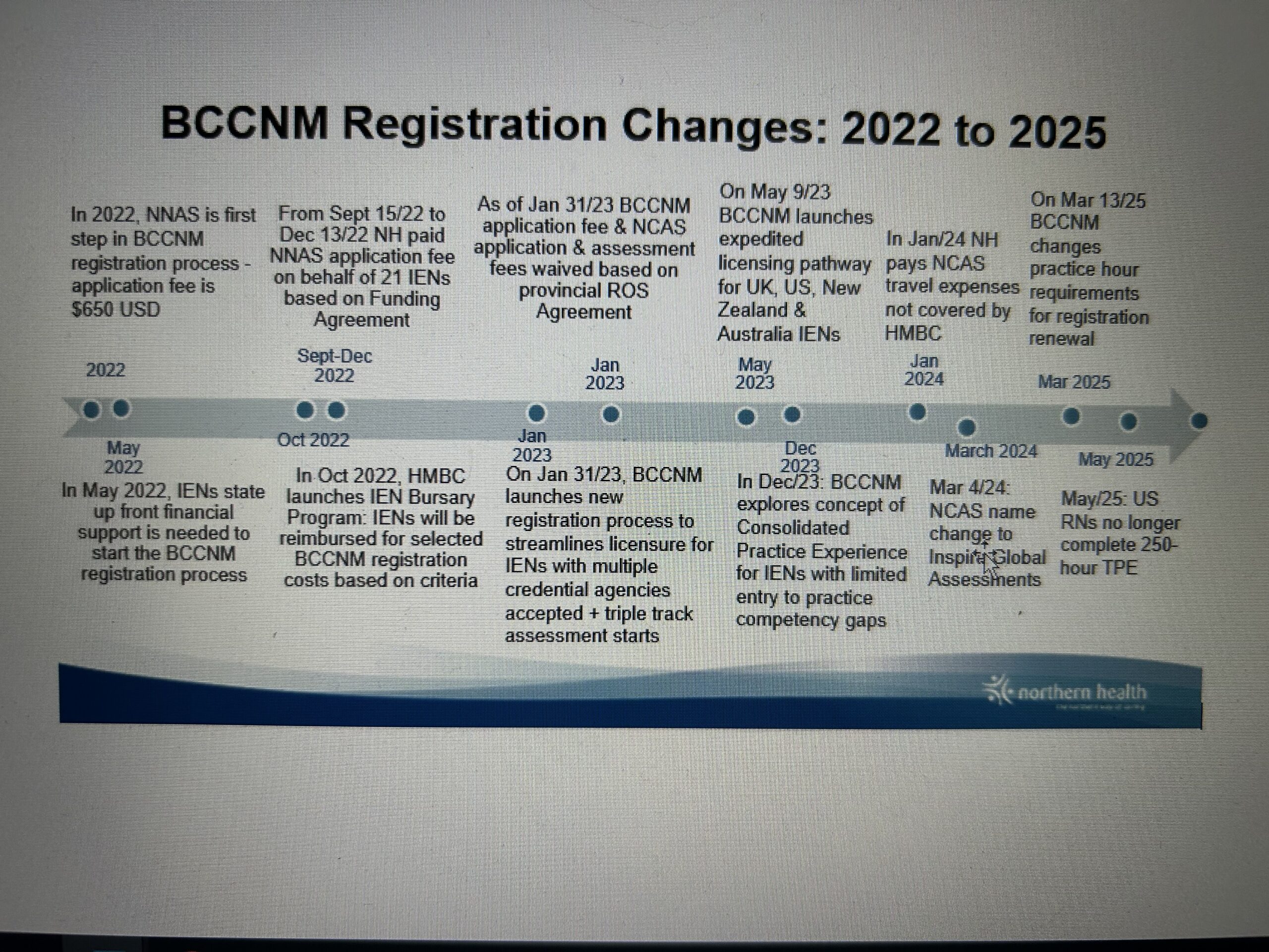Access to affordable and timely education is crucial for nurses returning to practice after an assessment. Unfortunately, very few programs available in British Columbia can help fill this gap. These programs could include bridging programs or return-to-nursing or re-entry programs. Our team is working hard to find ways to address this gap, especially for those living in northern BC. Our goal is to create or use existing programs and pathways to support IEN careers and help ensure success for nurses in this region.
